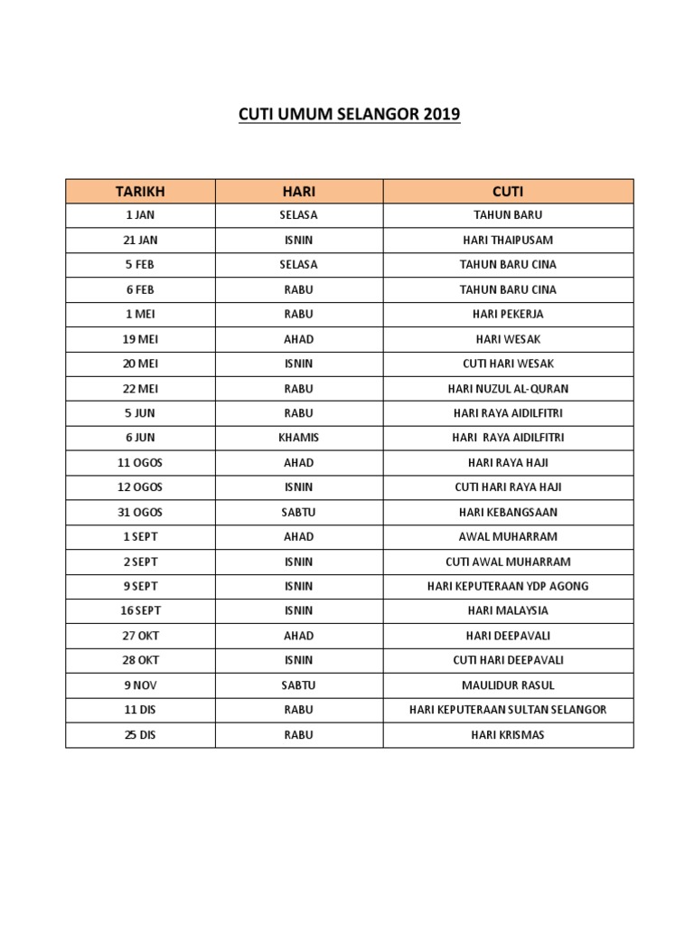 Muat turun atau download senarai cuti umum di Negeri Selangor dalam PDF di CUTI SELANGOR Nota Penting Hari Kelepasan Am Hari kelepasan am negeri Selangor adalah Tahun. Kalendar Cuti Umum Malaysia 2019 2020 24 Cuti Panjang Hujung Minggu Cara Atasi Rambut Gugur Kalender Cuti Umum Dan Cuti Sekolah Tahun 2021 Infosemasa 2021 Hari. Berikut adalah kalendar cuti umum bagi Negeri Selangor Darul Ehsan Tahun 2020 sepertimana disiarkan di Portal Rasmi Kerajaan Negeri Selangor.
